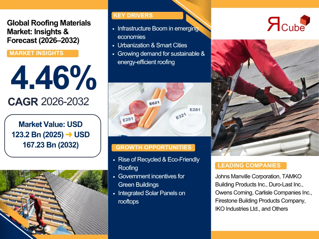 According to the latest report by The Report Cube, study Roofing Materials Market is anticipated to register a CAGR of around 4.46% during the forecast period 2026–32. The market is valued at approximately USD 123.2 billion in 2025 and is expected to reach nearly USD 167.23 billion by 2032.