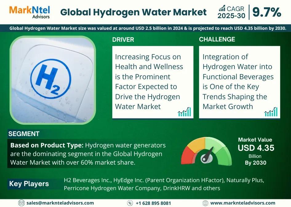 As per MarkNtel Advisors the Global Hydrogen Water Market size was valued at around USD 2.5 billion in 2024 and is projected to reach USD 4.35 billion by 2030. Along with this, the market is estimated to grow at a CAGR of around 9.7% during the forecast period, i.e., 2025-30. The global hydrogen water industry is growing impressively, as it has started being used in functional beverages too. Along with it, hydrogen-rich water has also seen notable demand, and thus the market for hydrogen water is expanding globally. Moreover, the increasing demand is driven by the rising consumer awareness about the benefits of hydrogen-rich water for health such as antioxidants and the ability to improve overall health. Therefore, the growing health consciousness, along with the demand for natural and low-sugar beverages are adding to the increasing popularity of hydrogen water. Asia-Pacific, North America, and Europe are among the most flourishing regions for hydrogen water.