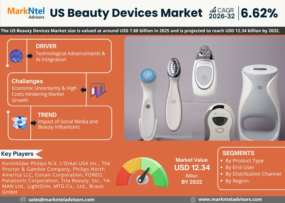 According to MarkNtel Advisors study The future of US Beauty Devices Market size is valued at around USD 7.88 billion in 2025 and is projected to reach USD 12.34 billion by 2032. Along with this, the market is estimated to grow at a CAGR of around 6.62% during the forecast period, i.e., 2026-32.