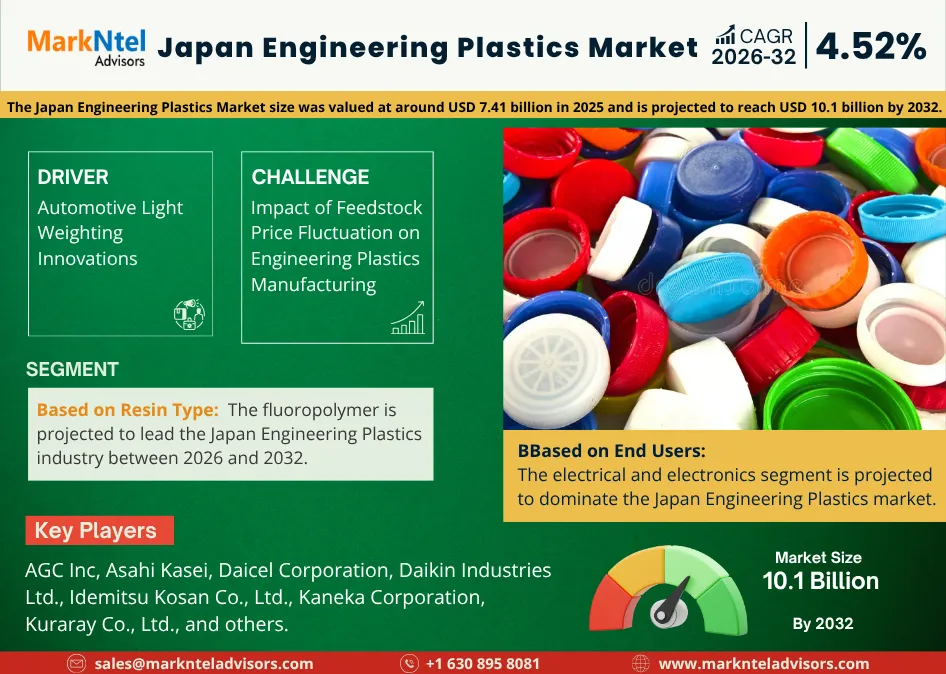 According to MarkNtel Advisors study The future of Japan Engineering Plastics Market size was valued at around USD 7.41 billion in 2025 and is projected to reach USD 10.1 billion by 2032. Along with this, the market is estimated to grow at a CAGR of around 4.52% during the forecast period, i.e., 2026-32.