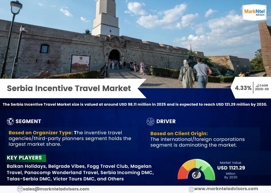 According to MarkNtel Advisors study The future of Serbia Incentive Travel Market size is valued at around USD 98.11 million in 2025 and is expected to reach USD 121.29 million by 2030. Along with this, the market is estimated to grow at a CAGR of around 4.33% during the forecast period, i.e., 2025-30.