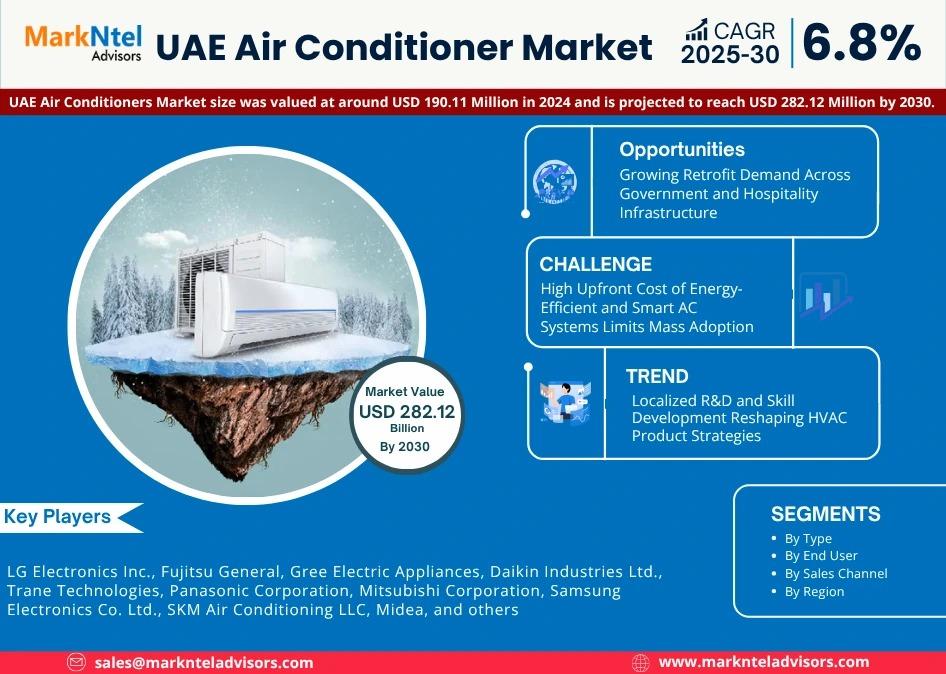 MarkNtel Advisors, a leading market research and consulting firm, has announced the release of its latest study titled UAE Air Conditioner Market Research Report: Forecast (2025–2030). This report provides a detailed assessment of the UAE Air Conditioner, covering its evolving dynamics, emerging trends, key growth drivers, major challenges, and competitive landscape.