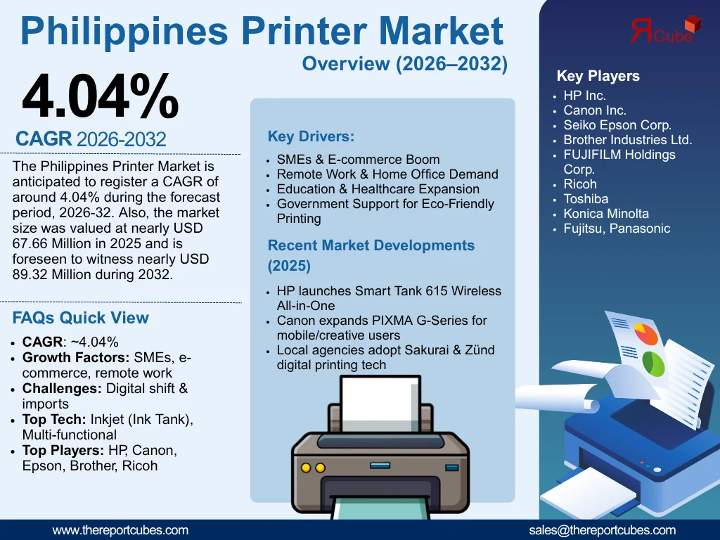 According to the latest report by The Report Cube, study Philippines Printer Market is anticipated to register a CAGR of around 4.04% during the forecast period, 2026-32. Also, the market size was valued at nearly USD 67.66 Million in 2025 and is foreseen to witness nearly USD 89.32 Million during 2032.