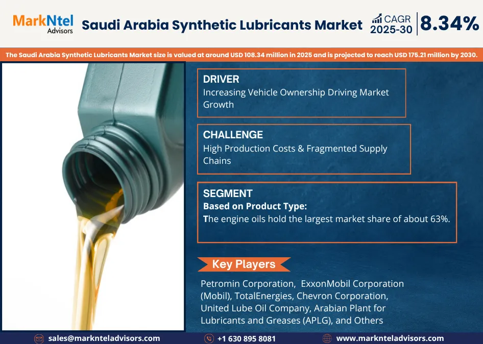 According to MarkNtel Advisors study The future of Saudi Arabia Synthetic Lubricants Market size is valued at around USD 108.34 million in 2025 and is projected to reach USD 175.21 million by 2030. Along with this, the market is estimated to grow at a CAGR of around 8.34% during the forecast period, i.e., 2025-30.