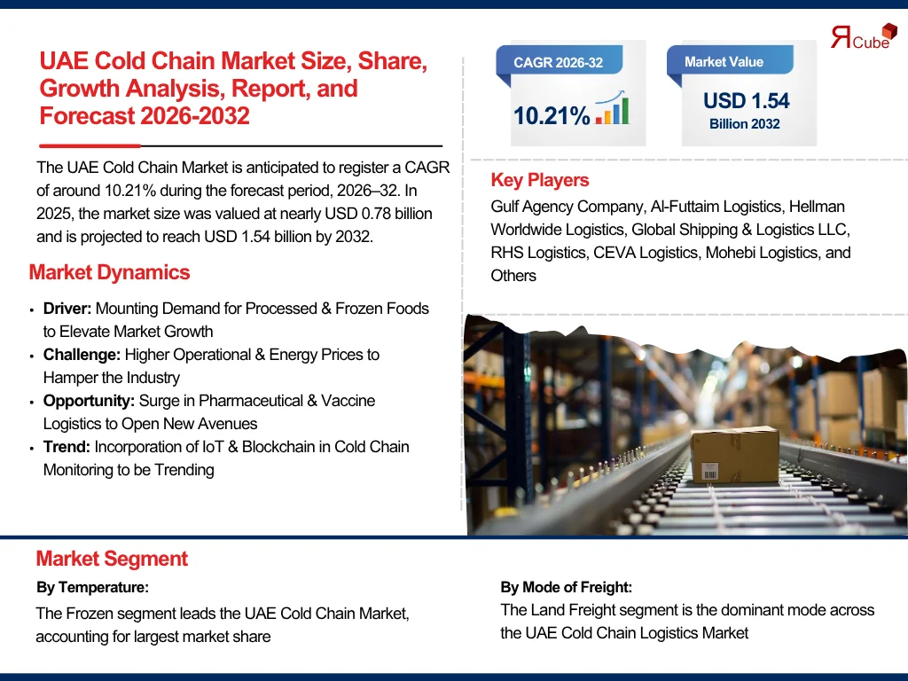 According to the latest report by The Report Cube, study UAE Cold Chain Market is anticipated to register a CAGR of around 10.21% during the forecast period, 2026–32. In 2025, the market size was valued at nearly USD 0.78 billion and is projected to reach USD 1.54 billion by 2032.