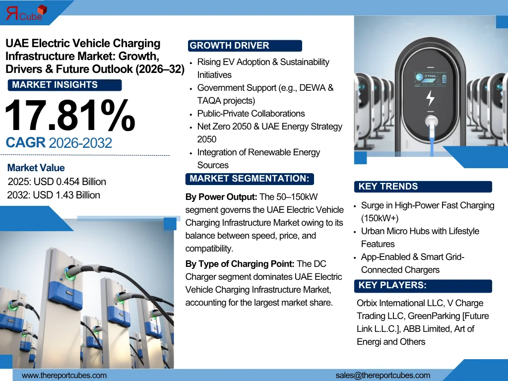 According to the latest report by The Report Cube, study UAE Electric Vehicle Charging Infrastructure Market is anticipated to register a CAGR of around 17.81% during the forecast period, 2026–32. The market size was valued at nearly USD 0.454 billion in 2025, and it is expected to reach approximately USD 1.43 billion by 2032.