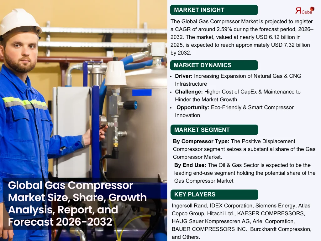 According to the latest report by The Report Cube, study Gas Compressor Market is projected to register a CAGR of around 2.59% during the forecast period, 2026–2032. The market, valued at nearly USD 6.12 billion in 2025, is expected to reach approximately USD 7.32 billion by 2032. The market growth is supported by increasing energy demand, growing pipeline infrastructure, and development in sectors like petrochemicals, oil & gas, and power generation.