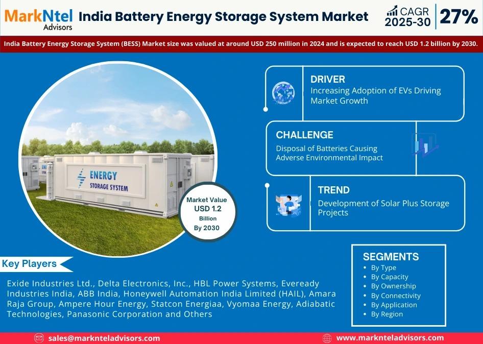 MarkNtel Advisors, a leading market research and consulting firm, has announced the release of its latest study titled India Battery Energy Storage System (BESS) Market Research Report: Forecast (2025-2030). This report provides a detailed assessment of the India Battery Energy Storage System (BESS) Market, covering its evolving dynamics, emerging trends, key growth drivers, major challenges, and competitive landscape.