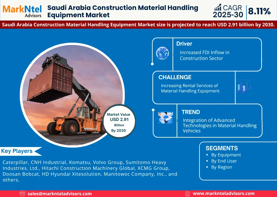 According to MarkNtel Advisors study The future of Saudi Arabia Construction Material Handling Equipment Market size was valued at around USD 1.77 billion in 2024 and is projected to reach USD 2.91 billion by 2030. The market is also estimated to grow at a CAGR of around 8.11% during the forecast period, i.e., 2025-30.