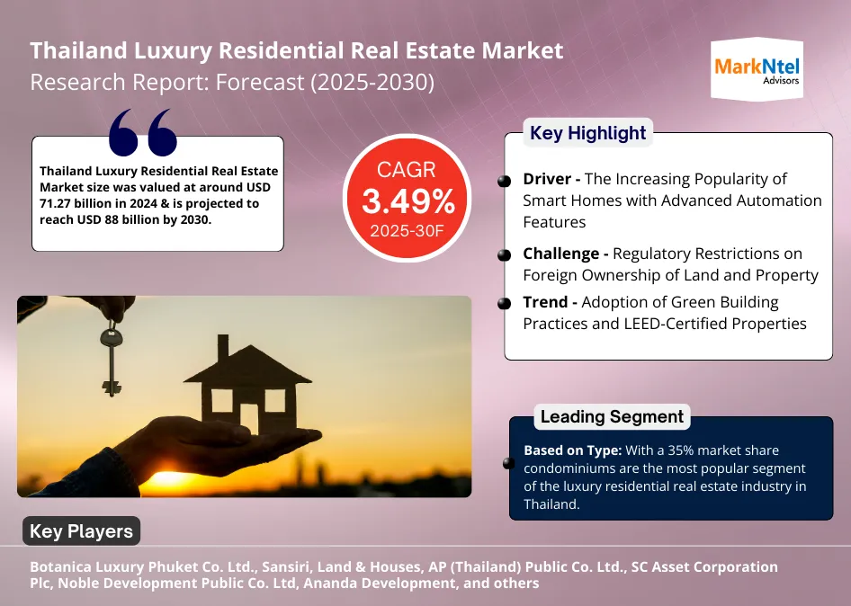According to MarkNtel Advisors study The future of Thailand Luxury Residential Real Estate Market size was valued at around USD 71.27 billion in 2024 and is projected to reach USD 88 billion by 2030. Along with this, the market is estimated to grow at a CAGR of around 3.49% during the forecast period, i.e., 2025-30.