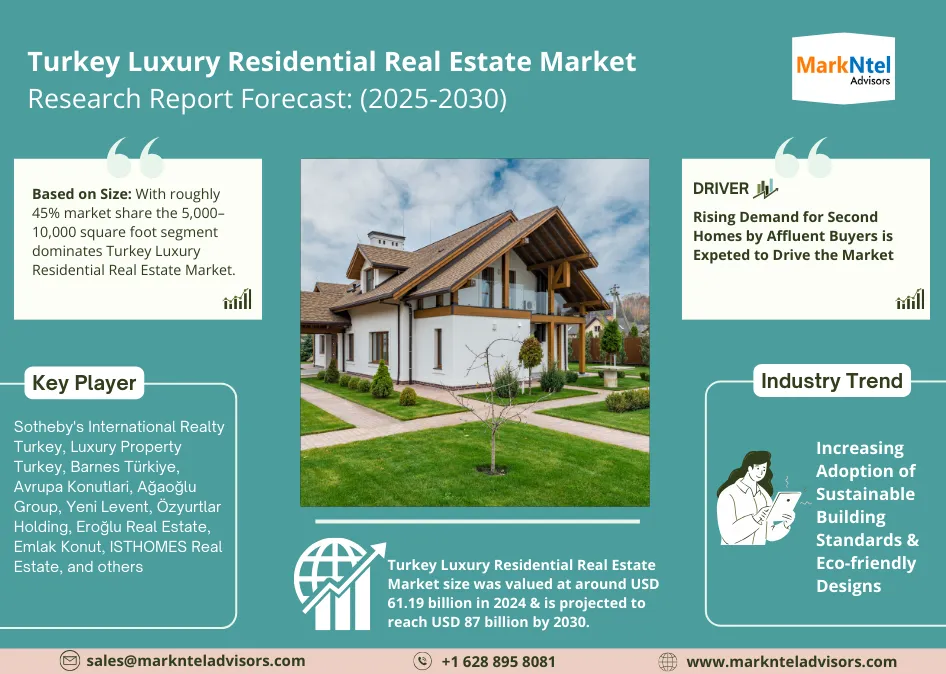 According to MarkNtel Advisors study The future of Turkey Luxury Residential Real Estate Market size was valued at around USD 61.19 billion in 2024 and is projected to reach USD 87 billion by 2030. Along with this, the market is estimated to grow at a CAGR of around 6.11% during the forecast period, i.e., 2025-30.