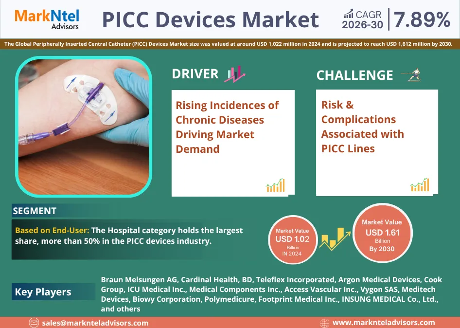 According to MarkNtel Advisors study The future of Peripherally Inserted Central Catheter (PICC) Devices Market size was valued at around USD 1,022 million in 2024 and is projected to reach USD 1,612 million by 2030. Along with this, the market is estimated to grow at a CAGR of around 7.89% during the forecast period, i.e., 2026-30.