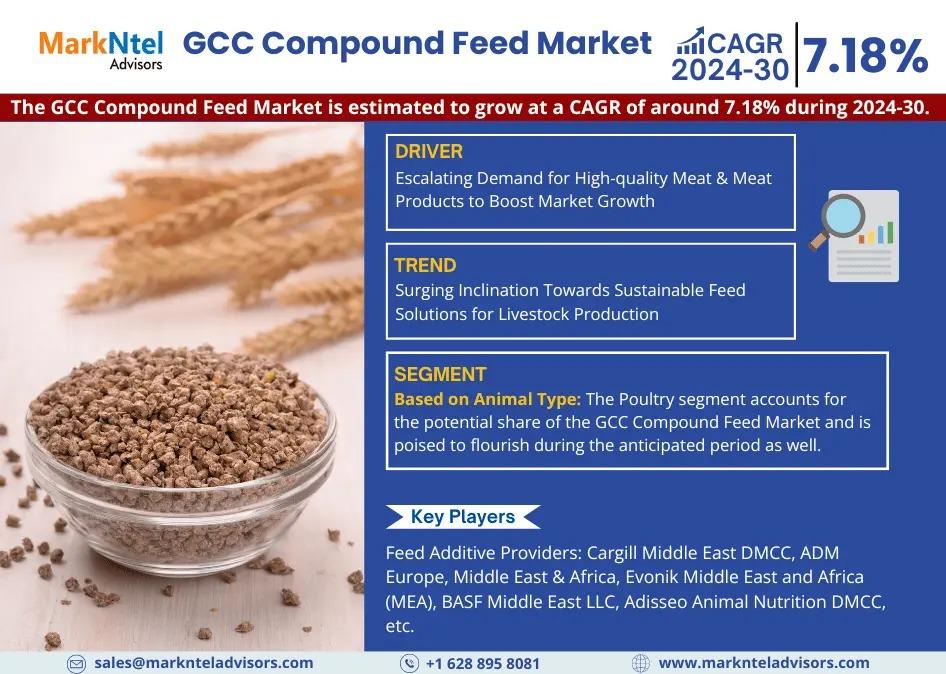 MarkNtel Advisors, a leading market research and consulting firm, has announced the release of its latest study titled GCC Compound Feed Market Research Report: Forecast (2024-2030). This report provides a detailed assessment of the GCC Compound Feed Market, covering its evolving dynamics, emerging trends, key growth drivers, major challenges, and competitive landscape.