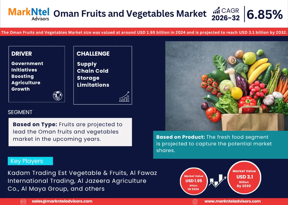 According to MarkNtel Advisors study The future of Oman Fruits and Vegetables Market size was valued at around USD 1.95 billion in 2024 and is projected to reach USD 3.1 billion by 2032. Along with this, the market is estimated to grow at a CAGR of around 6.85% during the forecast period, i.e., 2026-32.