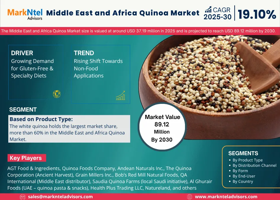 According to MarkNtel Advisors study The future of Middle East and Africa Quinoa Market size is valued at around USD 37.19 million in 2025 and is projected to reach USD 89.12 million by 2030. Along with this, the market is estimated to grow at a CAGR of around 19.10% during the forecast period, i.e., 2025-30.