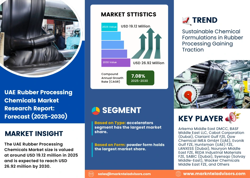 As per recent study by Markntel Advisors The UAE Rubber Processing Chemicals Market size is valued at around USD 19.12 million in 2025 and is expected to reach USD 26.92 million by 2030. Along with this, the market is estimated to grow at a CAGR of around 7.08% during the forecast period, i.e., 2025-30.