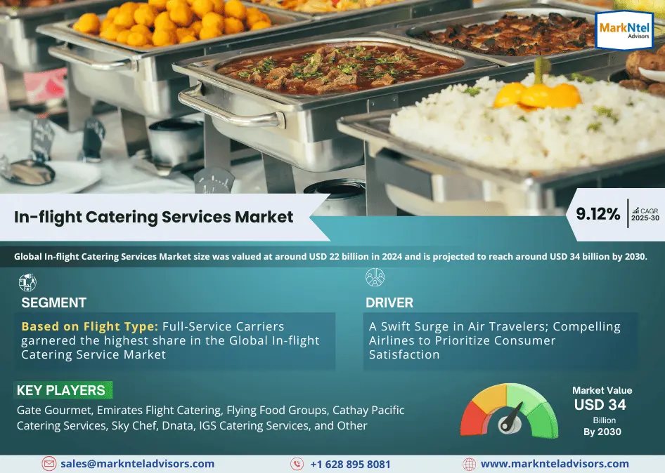 According to MarkNtel Advisors study The future of In-flight Catering Services Market size was valued at around USD 22 billion in 2024 and is projected to reach around USD 34 billion by 2030. Along with this, the market is anticipated to grow at a CAGR of around 9.12% during the forecast period, i.e., 2025-30.