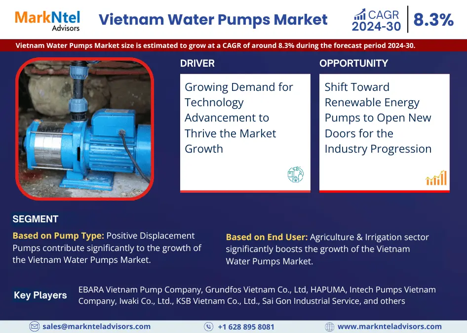 According to MarkNtel Advisors study The future of Vietnam Water Pumps Market size is estimated to grow at a CAGR of around 8.3% during the forecast period, i.e., 2024-30.