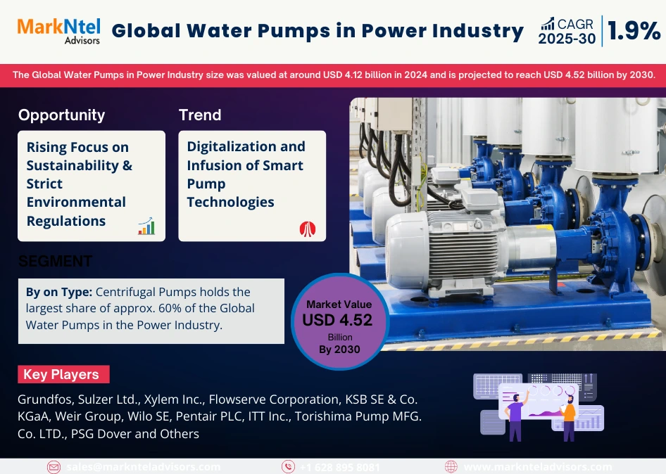 According to MarkNtel Advisors study The future of Water Pumps in Power Industry Market size was valued at around USD 4.12 billion in 2024 and is projected to reach USD 4.52 billion by 2030. Along with this, the market is estimated to grow at a CAGR of around 1.9% during the forecast period, i.e., 2025-30.