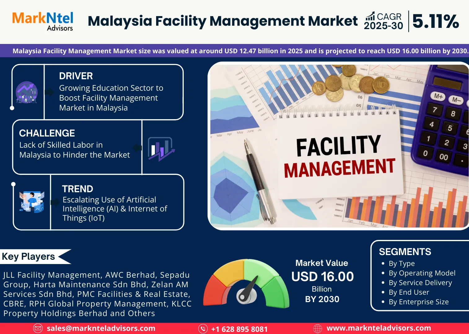 According to MarkNtel Advisors study The future of Malaysia Facility Management Market size was valued at around USD 12.47 billion in 2025 and is projected to reach USD 16.00 billion by 2030. Along with this, the market is estimated to grow at a CAGR of around 5.11% during the forecast period, i.e., 2025-30.