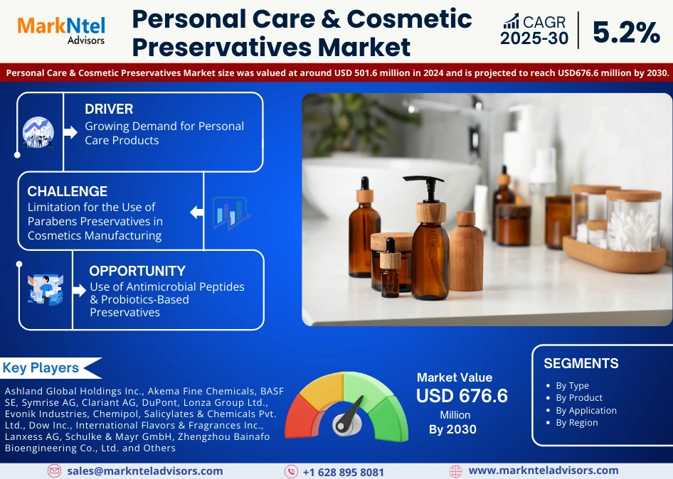 According to MarkNtel Advisors study The future of Personal Care & Cosmetic Preservatives Market size was valued at around USD 501.6 million in 2024 and is projected to reach USD 676.6 million by 2030. Along with this, the market is estimated to grow at a CAGR of around 5.2% during the forecast period, i.e., 2025-30.
