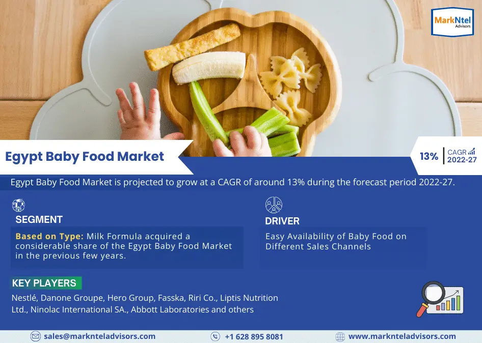 According to MarkNtel Advisors study The future of Egypt Baby Food Market is projected to grow at a CAGR of around 13% during the forecast period, i.e., 2022-27.