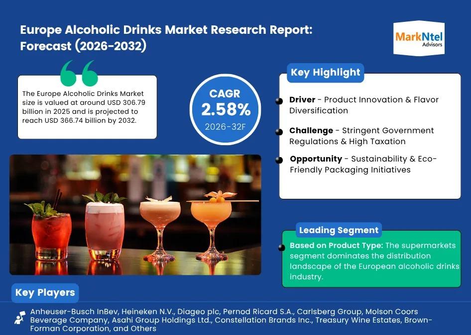 MarkNtel Advisors, a leading market research and consulting firm, has announced the release of its latest study titled Europe Alcoholic Drinks Market Research Report: Forecast (2026-2032). This report provides a detailed assessment of the Europe Alcoholic Drinks Market, covering its evolving dynamics, emerging trends, key growth drivers, major challenges, and competitive landscape.