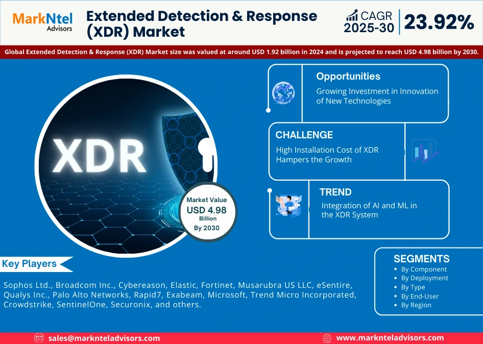 The Extended Detection & Response (XDR) Market size was valued at around USD 1.92 billion in 2024 and is projected to reach USD 4.98 billion by 2030. Along with this, the market is estimated to grow at a CAGR of around 23.92% during the forecast period, i.e., 2025-30. The Global XDR Market growth is due to the increase in cyberattacks, the government support in cybersecurity, the digitalization of sectors such as banks, healthcare, etc., and its expansion with AI and cloud services etc. across multiple regions.