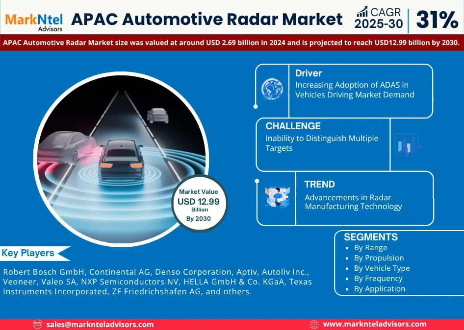 According to MarkNtel Advisors study The future of APAC Automotive Radar Market size was valued at around USD 2.69 billion in 2024 and is projected to reach USD 12.99 billion by 2030. Along with this, the market is estimated to grow at a CAGR of around 31% during the forecast period, i.e., 2025-30.