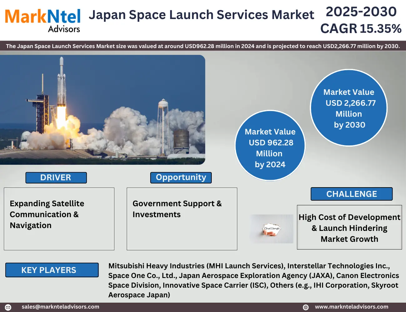 According to MarkNtel Advisors study The future of Japan Space Launch Services Market size was valued at around USD962.28 million in 2024 and is projected to reach USD2,266.77 million by 2030. Along with this, the market is estimated to grow at a CAGR of around 15.35% during the forecast period, i.e., 2025-30.