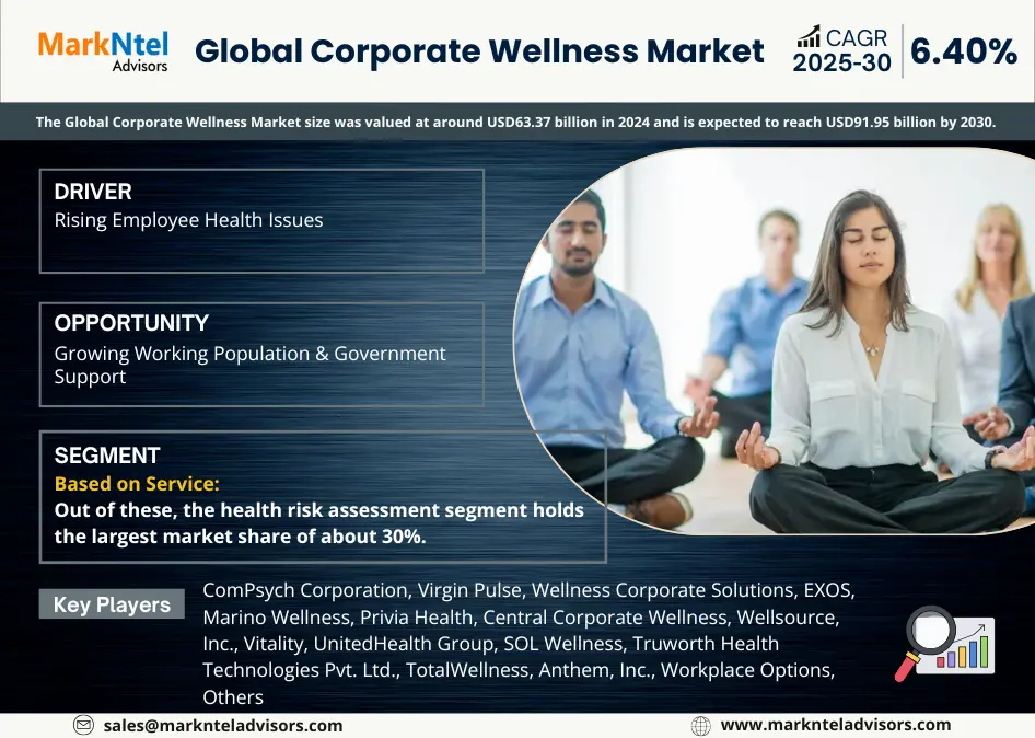 According to MarkNtel Advisors study The future of Corporate Wellness Market size was valued at around USD63.37 billion in 2024 and is expected to reach USD91.95 billion by 2030. Along with this, the market is estimated to grow at a CAGR of around 6.40% during the forecast period, i.e., 2025-30.