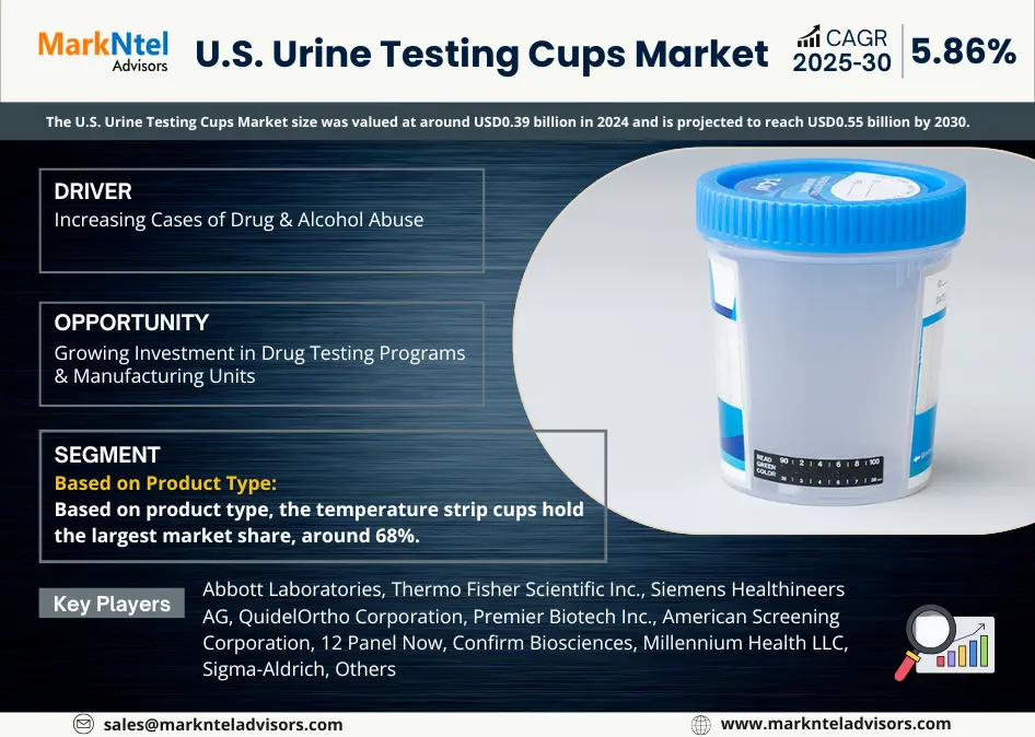 According to MarkNtel Advisors study The future of U.S. Urine Testing Cups Market size was valued at around USD0.39 billion in 2024 and is projected to reach USD0.55 billion by 2030. Along with this, the market is estimated to grow at a CAGR of around 5.86% during the forecast period, i.e., 2025-30.