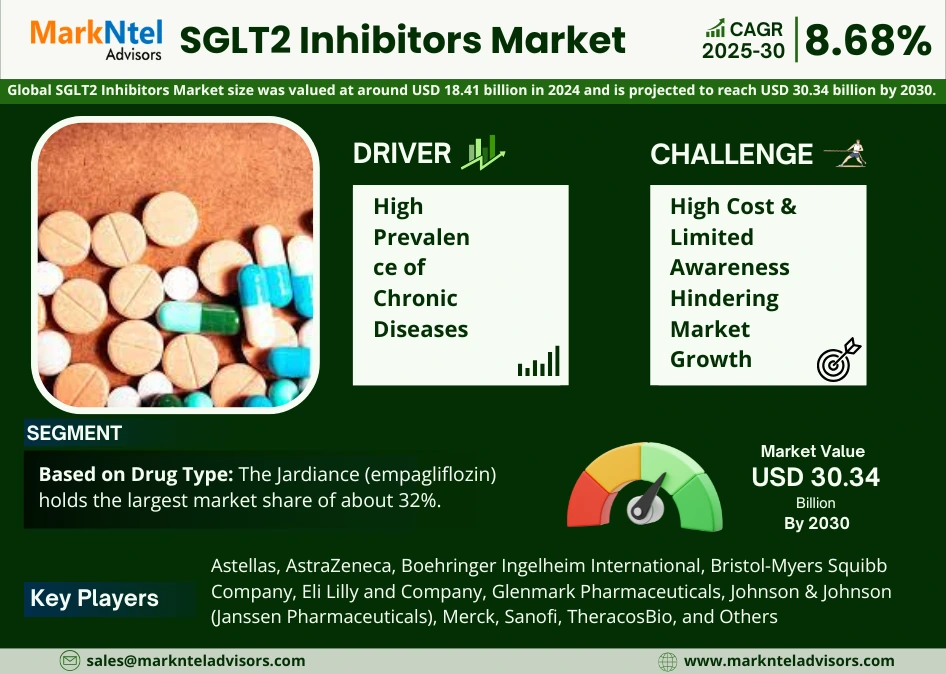 According to MarkNtel Advisors study The future of SGLT2 Inhibitors Market size was valued at around USD 18.41 billion in 2024 and is projected to reach USD 30.34 billion by 2030. Along with this, the market is estimated to grow at a CAGR of around 8.68% during the forecast period, i.e., 2025-30.