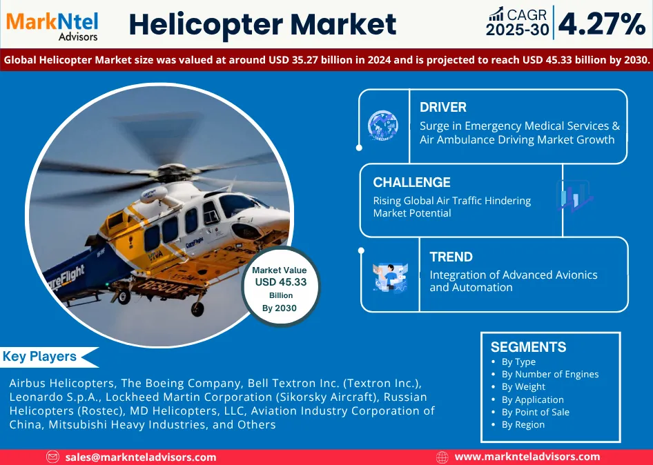 According to MarkNtel Advisors study The future of Global Helicopter Market size was valued at around USD 35.27 billion in 2024 and is projected to reach USD 45.33 billion by 2030. Along with this, the market is estimated to grow at a CAGR of around 4.27% during the forecast period, i.e., 2025-30.