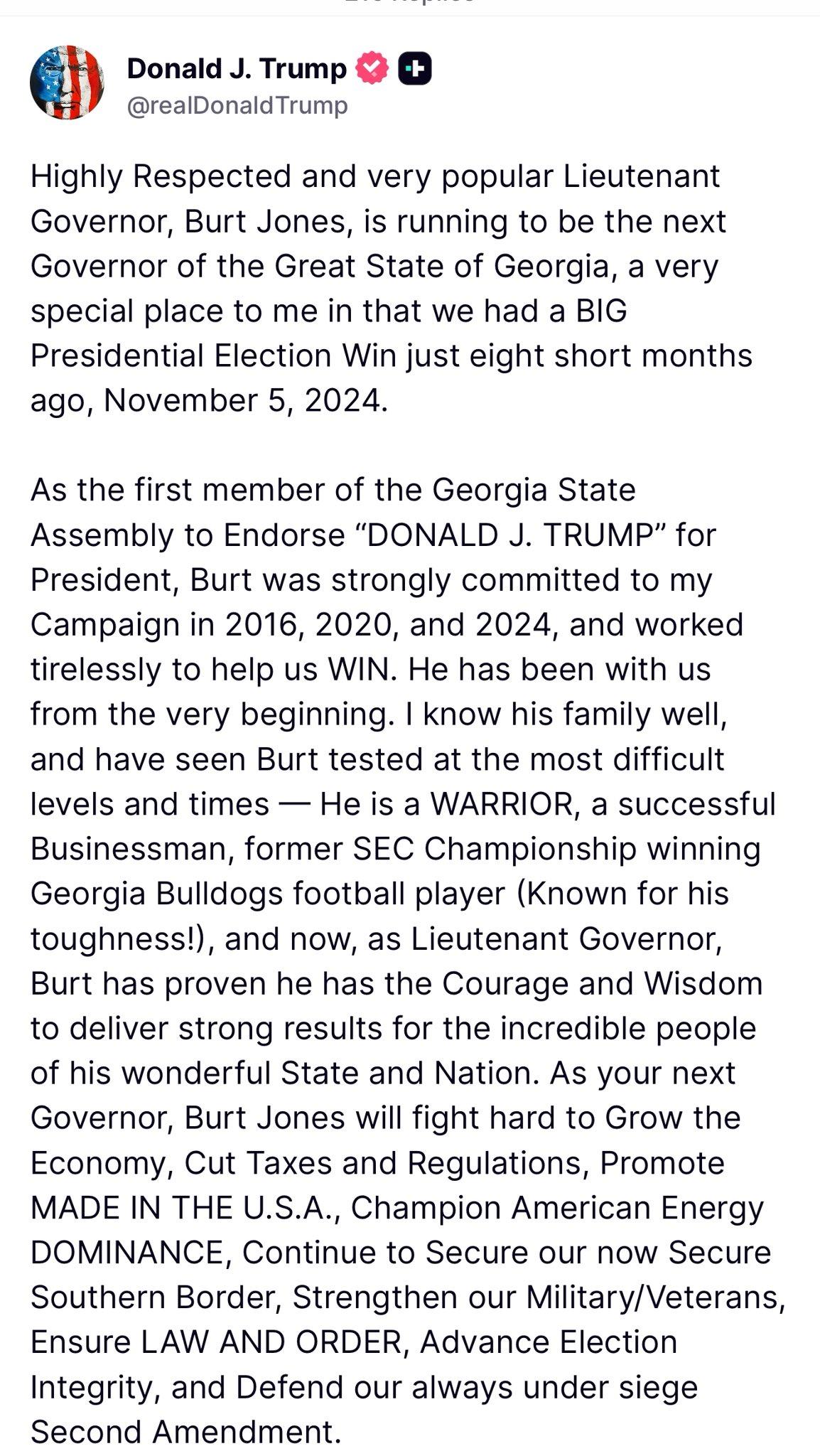 BREAKING: President Trump just endorsed Lt Governor BURT JONES for Governor of GEORGIA in 2026BREAKING: President Trump just endorsed Lt Governor BURT JONES for Governor of GEORGIA in 20260 Yorumlar 0 hisse senetleri 148 Views