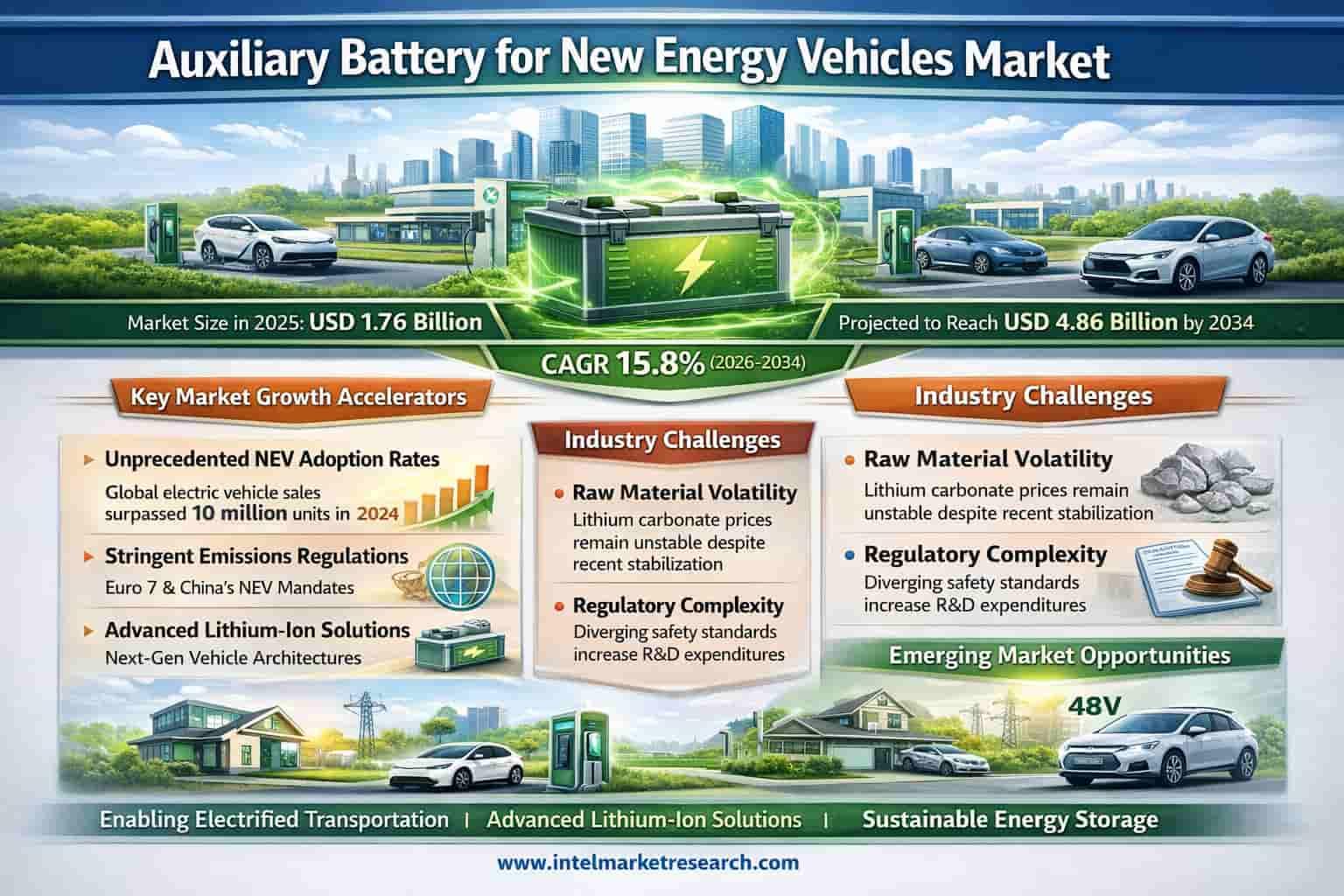 Auxiliary Battery for New Energy Vehicles Market’s CAGR of 15.8%: Top 10 Companies Leading the Charge in 2034 Global Auxiliary Battery for New Energy Vehicles market was valued at USD 1.76 billion in 2025 and is projected to reach USD 4.86 billion by 2034, growing at an impressive CAGR of 15.8% during the forecast period (2026-2034). πŸ“₯ Download FREE Sample Report: https://www.intelmarketresearch.com/download-free-sample/30657/auxiliary-battery-for-new-energy-vehicles-market 🌐 Website: https://www.intelmarketresearch.com πŸ“ž Asia-Pacific: +91 9169164321 πŸ”— LinkedIn: Follow Us