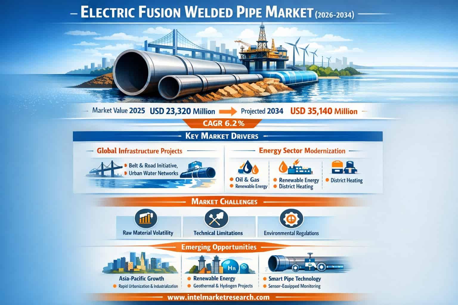 Electric Fusion Welded Pipe Market’s CAGR of 6.2%: Top 10 Companies Leading the Charge in 2034 Global Electric Fusion Welded Pipe market was valued at USD 23,320 million in 2025 and is projected to reach USD 35,140 million by 2034, growing at a CAGR of 6.2% during the forecast period (2026-2034). πŸ“₯ Download Sample Report: https://www.intelmarketresearch.com/download-free-sample/29857/electric-fusion-welded-pipe-market 🌐 Website: https://www.intelmarketresearch.com πŸ“ž Asia-Pacific: +91 9169164321 πŸ”— LinkedIn: Follow Us