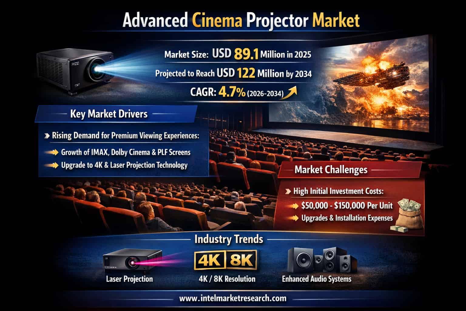 Advanced Cinema Projector Market’s CAGR of 4.7%: Top 10 Companies Leading the Charge in 2034 Global Advanced Cinema Projector market was valued at USD 89.1 million in 2025 and is projected to reach USD 122 million by 2034, growing at a steady CAGR of 4.7% during the forecast period (2026-2034). πŸ“₯ Download FREE Sample Report: https://www.intelmarketresearch.com/download-free-sample/29616/advanced-cinema-projector-market 🌐 Website: https://www.intelmarketresearch.com πŸ“ž Asia-Pacific: +91 9169164321 πŸ”— LinkedIn: Follow Us