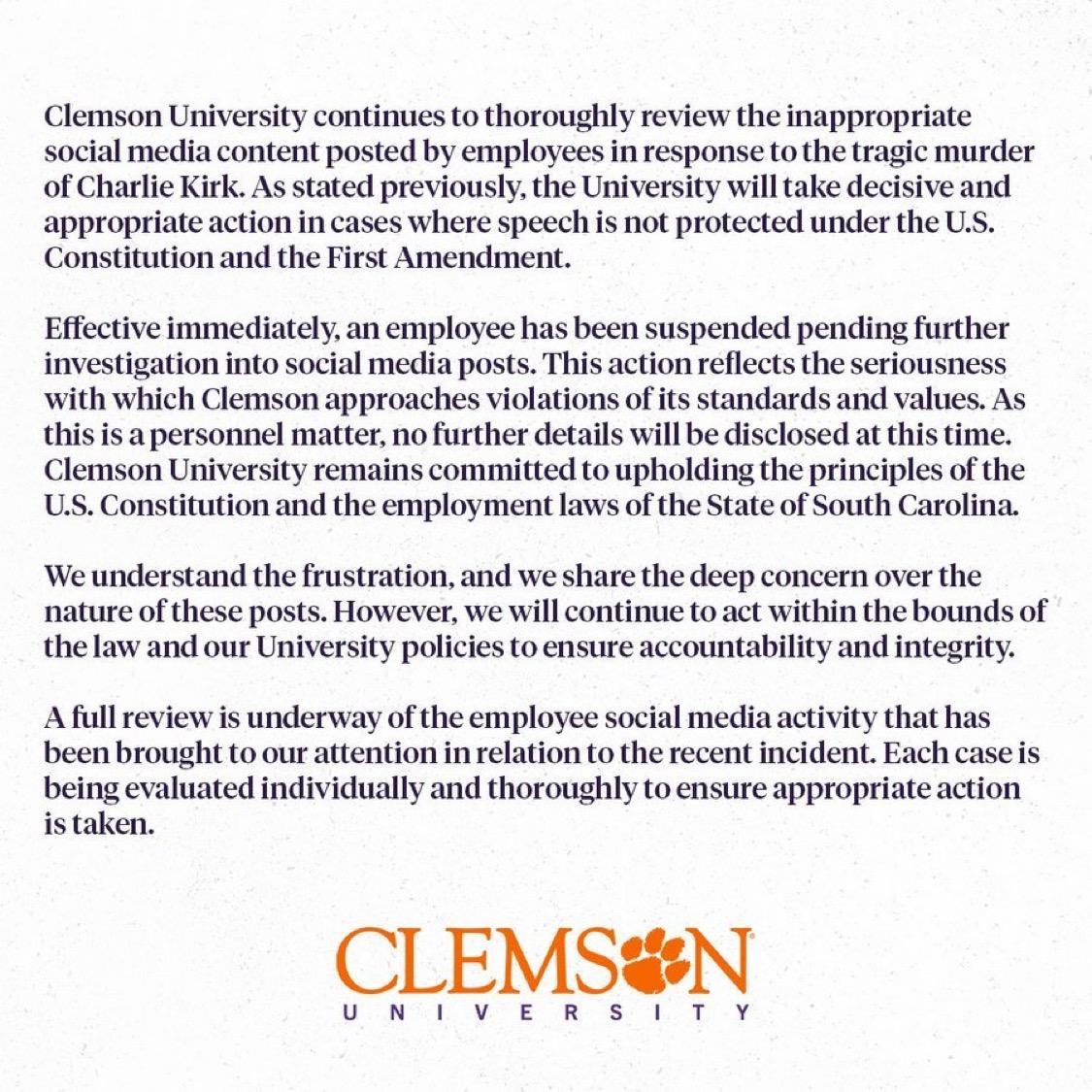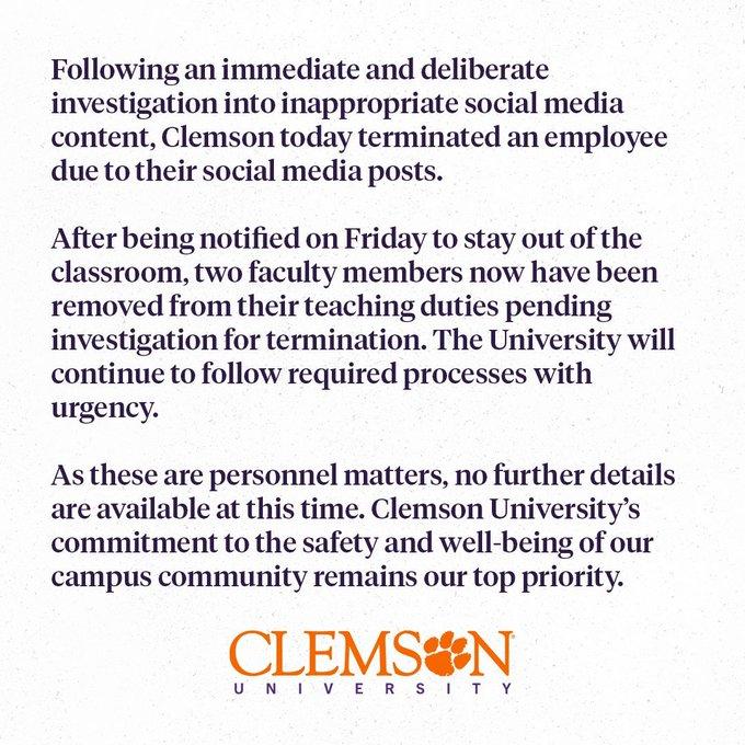 BREAKING: Clemson University CAVES to pressure, says faculty members who celebrated Charlie Kirk's death were removed from their teaching duties and are "pending investigation for termination."