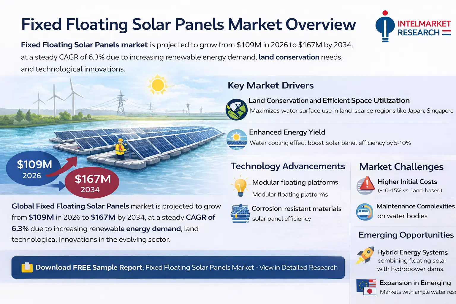 Global FPV (Floating Photovoltaic) Systems Industry Report & Competitive Landscape According to a new report from Intel Market Research, Global Fixed Floating Solar Panels market was valued at USD 109 million in 2025 and is projected to reach USD 167 million by 2034, growing at a steady CAGR of 6.3% during the forecast period (2026–2034). This growth is driven by increasing renewable energy demand, land conservation needs, and technological innovations in photovoltaic systems. What are Fixed Floating Solar Panels? Fixed floating solar panels are photovoltaic systems mounted on stationary platforms deployed on water bodies such as reservoirs, lakes, and other calm water surfaces. Unlike ground-mounted solar installations, these systems utilize underutilized water surfaces, making them ideal for regions with limited land availability. The technology offers dual benefits of energy generation and reduced water evaporation, particularly valuable in water-scarce regions. This report provides comprehensive insights into the global Fixed Floating Solar Panels market, covering market dynamics, competitive landscape, key applications, and regional analysis. The study helps stakeholders understand market opportunities, technological trends, and strategic imperatives in this evolving sector. 📥 Download FREE Sample Report: https://www.intelmarketresearch.com/download-free-sample/25425/fixed-floating-solar-panels-market 📥 Download FREE Sample Report: Fixed Floating Solar Panels Market - View in Detailed Research Report