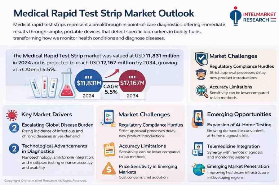According to a new report from Intel Market Research, Global Medical Rapid Test Strip market was valued at USD 11,831 million in 2026 and is projected to reach USD 17,167 million by 2034, growing at a steady CAGR of 5.5% during the forecast period. This growth reflects the expanding role of rapid diagnostics in modern healthcare systems across both developed and developing nations.