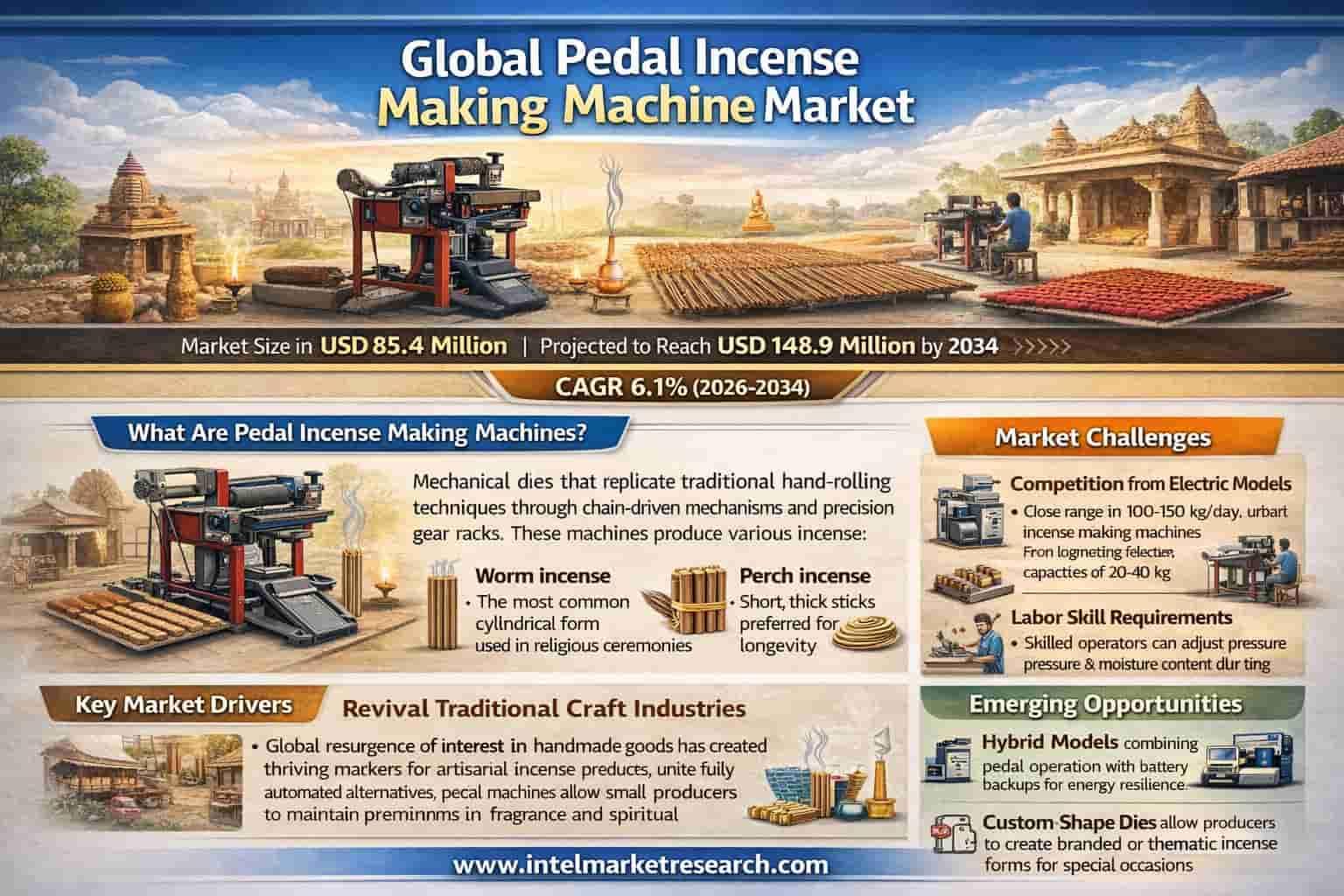 Global Pedal Incense Making Machine Market Projected to Reach USD 148.9 Million by 2034, Growing at a 6.1% CAGR; Key Players and Trends Global Pedal Incense Making Machine market was valued at USD 85.4 million in 2025 and is projected to reach USD 148.9 million by 2034, growing at a moderate CAGR of 6.1% during the forecast period (2026–2034). 📥 Download FREE Sample Report: https://www.intelmarketresearch.com/download-free-sample/32083/pedal-incense-making-machine-market 🌐 Website: https://www.intelmarketresearch.com 📞 Asia-Pacific: +91 9169164321 🔗 LinkedIn: Follow Us