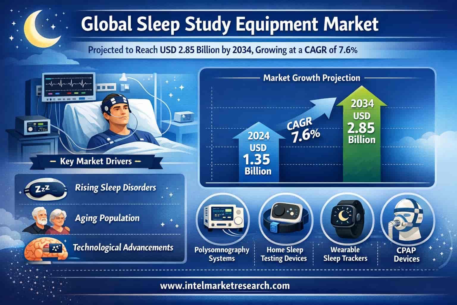 Global Sleep Study Equipment Market Projected to Reach USD 2.85 Billion by 2034, Growing at a CAGR of 7.6%; Key Players and Trends According to a new report published by Intel Market Research, the global Sleep Study Equipment Market was valued at USD 1.45 billion in 2025 and is projected to reach USD 2.85 billion by 2034, expanding at a CAGR of 7.6% during the forecast period (2026–2034). 📥 Download Free Sample Report: https://www.intelmarketresearch.com/download-free-sample/34843/sleep-study-equipment-market 🌐 Website: https://www.intelmarketresearch.com 📞 Asia-Pacific: +91 9169164321
